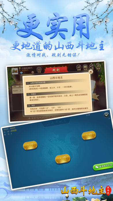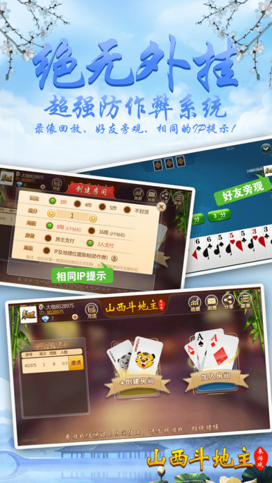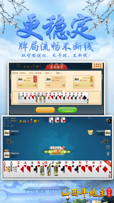 山西人都在玩的包房扑克游戏——斗地主,不玩你就out了 【最地道】 “斗地主”是一种三人玩的争先型牌类游戏,每局牌有一个玩家是“地主”,独自对抗另两个组成同盟的玩家; 地主的目标是先出完手里所有的牌,而农民的目标是在地主出完牌以前,农民中的任何一人先出完手里所有的牌; 让所有山西人玩上属于自己的斗地主! 【最好玩】 最接地气的扑克游戏,你可以再手机上随时随地和亲朋好友斗地主,是茶余饭后休闲良品。和亲朋好友一起开房,决一高下吧! 【最稳定】 大厂出品,确保游戏过程更加稳定,专心玩游戏,没有掉线卡顿烦恼。 【最靠谱】 可以录像回放,同IP报警,杜绝外挂,真实可靠。 【最智能】 智能提示、界面大方更具人性化,支持智能单独、分开支付房费。