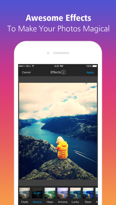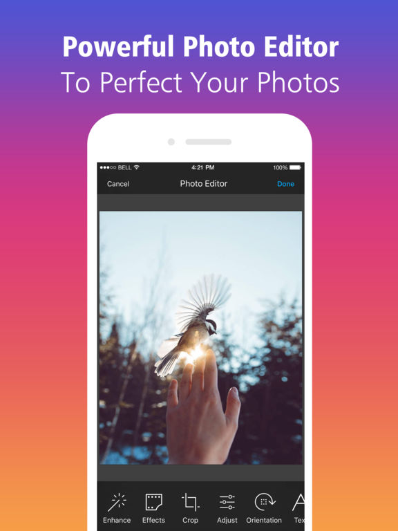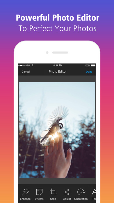 The best way to edit photos from your Camera Roll for uploading to anywhere. It couldn't be simpler by steps below: 1. Choose any photo from your photo library. 2. Add text or stickers to your photos. 3. Apply effect or draw on your photos. 4. Save to your camera roll. 5. Upload anywhere.