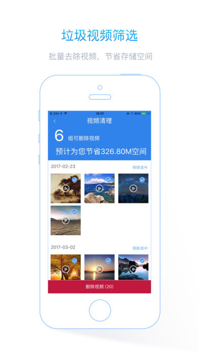 ==最后一天免费! 赶快下载吧!== 支持iOS 10! 这是一款实用的工具应用,帮助您搜索手机中重复的照片视频,通讯录信息,清理系统缓存和显示手机电池信息来帮助您更好更轻松的管理您的手机,同时节省手机存储空间. 主要功能: • 搜索重复的照片或者视频 运用多种图形比对算法,找出重复或者相似的照片视频,直接删除重复照片视频,节省手机存储空间. • 删除重复通讯录 扫描通讯录,检测出通讯录中重复的联系人姓名,重复的电话号码和电子邮件,清除重复的通讯录信息,方便管理联系人信息 • 系统缓存清理 清理系统缓存,释放磁盘存储空间 • 电量显示 精准的预测续航能力,参数详细清楚