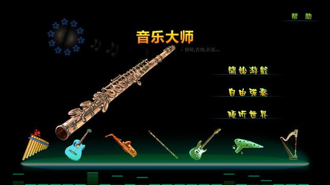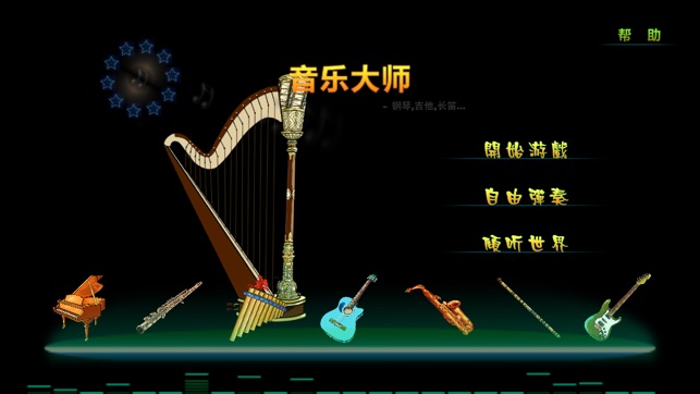 "音乐大师“ ,最好玩的音乐游戏,明亮的钢琴,忧伤的长笛,清澈的吉他,悠扬的萨克斯,古老的陶笛,神秘的竖琴,火热的爵士鼓,优美的小提琴,以及纯洁的手风琴,响亮的小号。今夜,让我们无思无想,沉浸在这悠扬,清澈,无论是淡淡的喜悦或者是丝丝的忧伤的乐曲中... 主要功能: . 超过15种流行乐器,个个音色优美 . 200多首流行古典音乐歌曲 . 震撼的玩法,给你最好的音乐大师的感觉