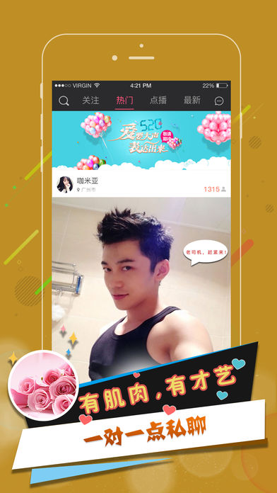 无数美女帅哥聚集,各种型号总有一款能与你匹配。 网红、模特、空姐、白领,这里真的有~ 鲜肉、硬汉,这里遍地走~ 轻轻动弹指尖,她/他来到你身边。 【任性福利】福利多多你懂的,直播好礼送不停。 【智能美颜】全自动美颜功能,自然更有吸引力。 【实时互动】拒绝延迟,拥有流畅的互动效果。 【高清赏析】拒绝马赛克,还原最真实。 【即时私聊】私密沟通,私信给有趣的人建立连接。 【任意直播】想怎么播就怎么播,轻松开启直播秀。