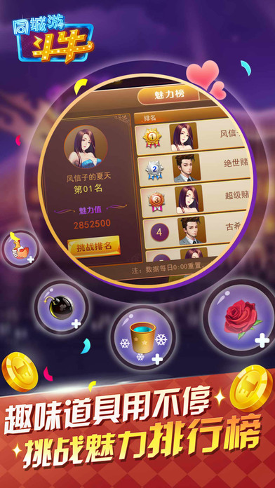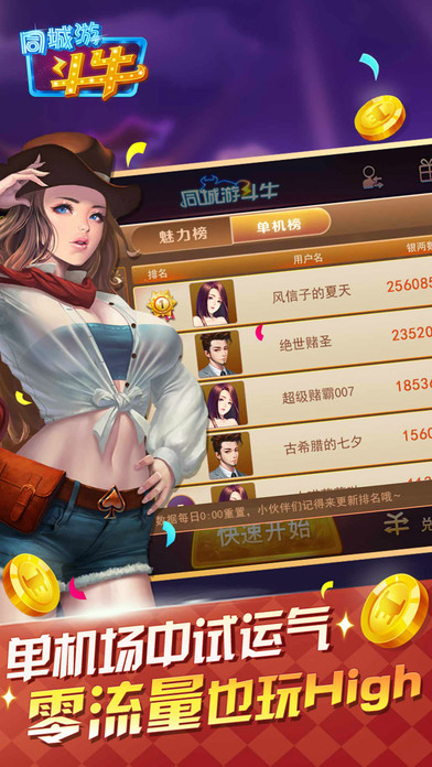 同城游斗牛(牛牛),又称五张牌,是一款运行流畅、画面精美、省流量,单机+联网玩法并存的棋牌游戏。2017年同城游斗牛游戏震撼上线,诚邀您畅享游戏乐趣。 斗牛玩法丰富看牌抢庄玩法,欢爆全场。斗牛单机版测测你的牌运如何,让你好运牛哄哄,无须流量就能玩牛牛。 牛牛玩法多样,坐庄玩法,赢遍全场;斗牛看牌抢庄,刺激无上限;经典玩法百人牛牛等你来体验,享受欢乐斗牛乐趣尽情体验。 斗牛牌面清晰,精致的筹码,公平的牛牛游戏环境,让你在趣味牛牛中乐不思蜀。 欢乐斗牛,快乐游戏,享受火拼牛牛的快乐!银子天天领,福利天天送。畅快淋漓天天斗牛,今天开始赚银吧。 同城游斗牛(牛牛)多人在线竞技游戏,单机省流量,还在等什么呢?一起欢乐斗牛吧!