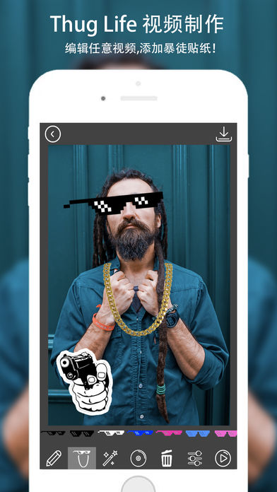 暴徒生活视频制作器! 该app可以完美的制作你想要的thug life 暴徒生活视频! 现在开始您可以制作流行的暴徒视频啦!在您喜爱的视频上面添加暴徒贴纸,翻转,移动,放大都能满足您的需求,开始制作你自己的暴徒视频! 制作步骤: 1.选择视频 2.选择视频帧 3.在视频帧上添加thug life贴纸,选择被音乐,视频动画以及选择贴纸入场动画等操作!完美的创造暴徒视频! 4.合成,分享好友,朋友圈
