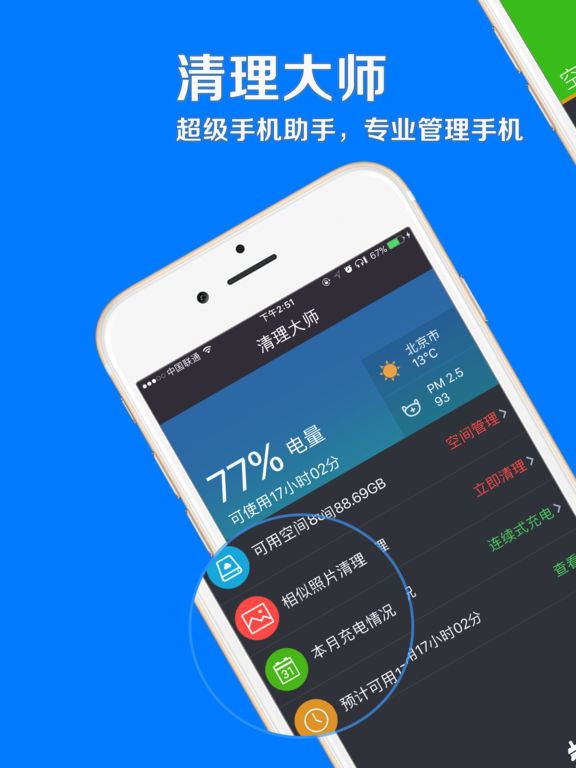 好用的手机助手来了! 杜绝虚假宣传!给你带来最实际的功能! 面向全球发售,简单,易用!功能全面! 准确的信息显示让你轻松管理! 【特色功能】 1.照片清理:一键清除重复照片,给手机更多可用空间。 2.空间管理,轻松管理空间,一键查看视频,音乐,照片,等等其他存储的使用量。 3.充电监控:最易用,最华丽的完全循环充电软件,更重要的是完全免费! 4.电池用量:准确预估电池可用时间 外出不必担心电量不足! 5.系统信息:精准系统信息显示,轻松了解系统运行状况! 6.天气提醒:精准告诉你今日天气状况,雾霾情况!