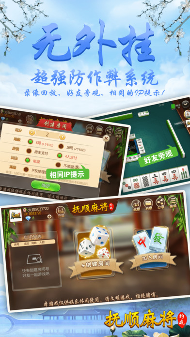 抚顺人民期待已久的包房麻将震撼出世! 【最地道】 地道抚顺麻将玩法,采用抚顺地区最流行的麻将规则。还有方言配音,要玩就玩抚顺人自己的麻将! 【最好玩】 再也不用苦于配桌,全民手机时代,你可以再手机上随时随地和亲朋好友搓麻将,是传统麻将馆的有力补充。快和亲朋好友一起开房,决一高下吧! 【最稳定】 大厂出品,确保游戏过程更加稳定,专心玩游戏,没有掉线卡顿烦恼。 【最靠谱】 可以录像回放,GPS预警,杜绝外挂,真实可靠。 【最智能】 智能提示、界面大方更具人性化,支持智能单独、分开支付房费。