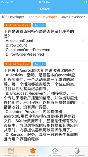 iTer 为一款IT工程师们提供知识充电的应用,IT知识学习、面试必备的工具,不断努力打造更多更好方式呈现更有趣的知识,让大家在零碎时间也可以快速和简单的学习get! - 10000+题目库,满足你的求知欲! - IT企业面试题目,为你完名企的梦! - IT知识题目大全,为你准备好的面试! - 永远不显示广告,让你静心学习知识!