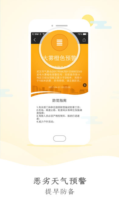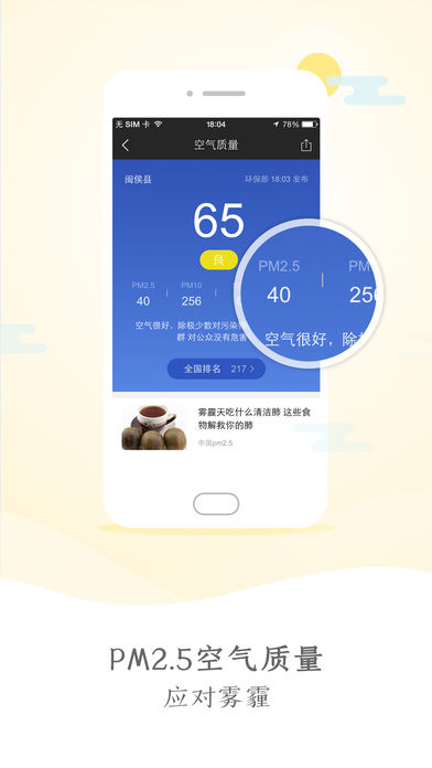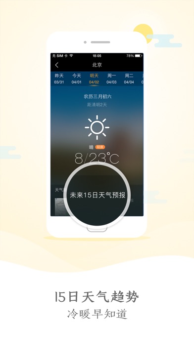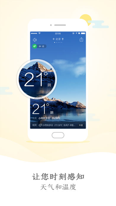 *短时预报:精准、及时预报您当前所处位置天气情况,关注你头顶每一朵云的改变。 *逐时预报:轻松查阅24小时内的天气变化及空气质量,提早预防早晚温差过大。