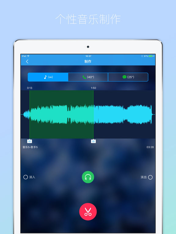 一首歌很长,我只要最经典的副歌. 喜欢一首歌的某一片段? 想制作属于自己独特的酷手机铃声吗? 音乐剪辑大师一款操作方便的mp3剪切工具.该音乐编辑器支持对MP3文件进行任意时间段的切割 - 从iTunes音乐库或本地文件夹导入音乐 - ,设置为你喜欢的片段,剪切音轨 - 多种音频裁剪模式,裁剪来电铃声、短信铃声,自由裁剪,随心所欲 - 自由选择淡入/淡出音频效果! - 连接电脑,轻松设置你最喜欢的一段作为铃声 - 一键分享,QQ,Facebook,微博等,与好友一起分享你的作品! 音乐剪辑大师,让你知道音频编辑从来没有那么难! 不管你是专业音乐人或是音乐小白,都能轻松玩转! 赶快下载试试吧~