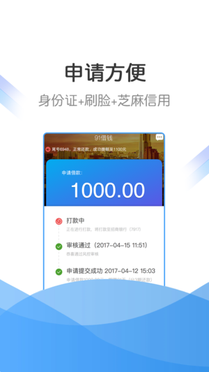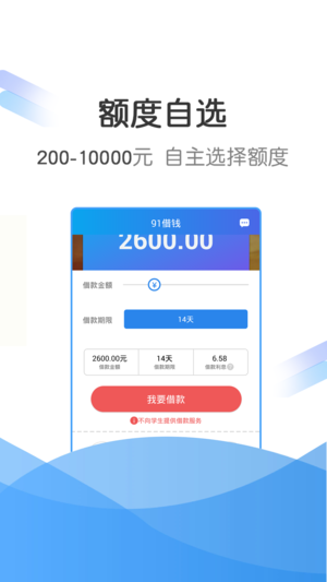 91借钱,3分钟认证,10分钟到账,无抵押,纯信用贷! 91借钱是一款简单便捷的信用借款产品,身份证+手机号的简单认证即可借款。最快5分钟到账,操作简单,服务费用低。利用大数据、人工智能来实现风控审批,速度又快又便捷。主要解决普通工薪族、个体户、蓝领等人群,提供日常生活资金周转需求。信用优质的用户无需任何抵押,即可更方便、快速的实现信用“变现”,解决个人短期资金紧张的问题。 【借钱快速】在线申请,快至5分钟放款! 【借钱简单】3分钟快速申请,10分钟快速审核,快速到账! 【额度灵活】小额借款,200-10000元额度,拒绝逾期! 【还款方便】在线还款,绑定银行卡,到期自动扣款!
