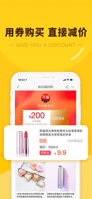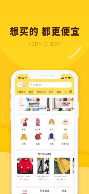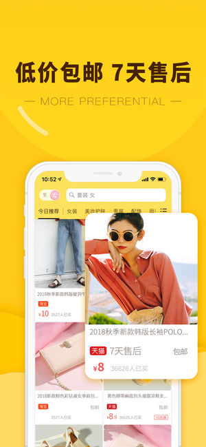 百万优惠券,省钱超多 -------功能特色 :之前淘宝都买贵了------- 【不买贵——百万优惠券】 购物前先领券,不花冤枉钱!网购节省至80%! 女装、男装、鞋包、美妆、护肤、家居、母婴、零食、数码...优惠一网打尽 【不浪费——花9.9买原价99】 每一分钱,都买得值。 【不纠结——100%包邮】 包邮+7天无理由退货=随心所欲想买就买。 -------各大网红倾情推荐:爱豆也在用------- 打开app前一定要有心理准备!,之前58买过一个蒸汽眼罩,这里看到一模一样只要18,真是气死我了…… ——@爱吃喵的小鱼 9块钱买了件T恤,收到之后觉得特别满意!全棉不透,印花很清楚…