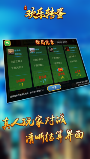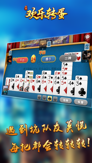 “转蛋”是一款流行于江苏扬州,盐城等地的扑克类游戏,由“惯蛋”演化而来.有道是:饭前不转蛋,等于没吃饭;饭后不转蛋,等于白吃饭. “转蛋”不是一个人的游戏,需要和队友配合,合理利用自己的手牌和队友一起打出精彩的牌局. “转蛋”识人:转蛋打的好,说明有头脑;转单打的精,说明思路清;转蛋不怕炸,说明胆子大;转蛋路数邪,说明懂科学;赢了不吵嚷,说明有涵养;输了不投降,竞争意识强;输赢都不走,能做一把手。 产品特点: (1)“转蛋”有换位系统,将分别获得2张明牌的玩家组成一队。 (2)“转蛋”没有升级系统,级牌永远为“2”。 (3)“转蛋”没有进贡和还贡系统。