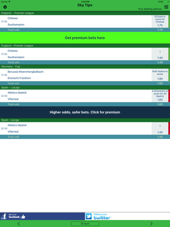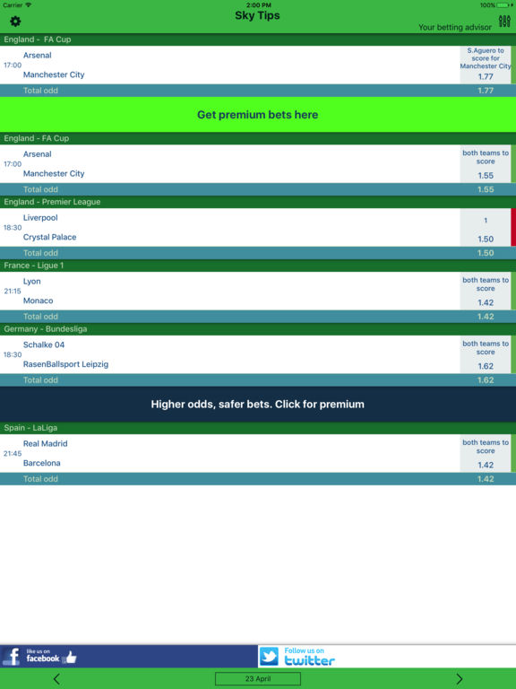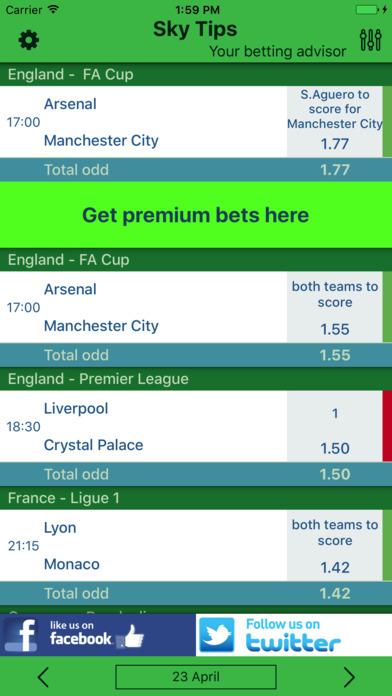 Best Odds and Tips from Your Premium Football Betting Advisor - Great Daily Predictions and Tips From Professional Bettors If you want to make money every day – this is our offer for you. The matches have odd over 1,30. Our team works for you 24/7. Our commitment: - We have for you the best football betting tips. - We help you to place smart bets with the best value. - We posted in time the tips to allow you to have a general view of the events and find good information. - We will ofer to you in weekends special tickets like: the player who scores. Increase money by trying our multiple prediction combinations, with our multiple tips: correct scores, over goals, players to score and more. Enjoy our free football betting tips and predictions posted every day by our professional tipsters. Sky Tips: Free Betting Tips from Profesional Tipsters for Football (Soccer) - Betting Lines - Betting Odds - Fixtures - Betting Tips - Spread Betting - Arbitrage - Rumours - Sure Bets - Predictions. Football : England Premier League, England Championship, Spanish Primera Liga BBVA, Spanish Liga Adelante, Scottish Premiership, Italian Serie A, Italian Serie B, France Ligue 1, France Ligue 2, Germany Bundesliga, Germany 2.Bundesliga, Belgium ProLeague, Swiss Super League, Turkey Super Lig, Czech Synot Liga, Prva HNL, Liga 1 Romania, Austria Football Bundesliga, Russian Premier League, Portugal Primeira Liga, Netherland Eredivisie, Netherlands Jupiler League, Denmark Superliga, Scotland Championship, Norway Tippeligaen, Slovakia Fortuna League, Moldova National Division, Israel Leumit League Poland Ekstraklasa, China Super League, Champions League, Europa League, MLS, FA Cup, League Cup, Copa Del Rey, Coppa Italia, Coupe de France, Coupe de la Ligue, DFB Pokal, Copa Libertadores, CONCACAF, 2nd Bundesliga, Beker Van Belgie, Paulista A1, Paulista A2, Primera A, Super League, I-League, World Cup, UEFA, EURO 2016, Friendlies matches. TIPS Explained / INDEX * 1,X,2 - simple bet 1 - means home team to win the game X - means game to end as a draw 2 - means away team to win the game * 1x,x2,12 - double chance 1x - means home team wins or draws x2 - means away team wins or draws 12 - means home team wins or away team wins * Under/Over goals bets Over 0,5 - means that tip is won if 1 or more goals are scored Over 1,5 - means the tip is won if 2 or more goals are scored Over 2,5 - means the tip is won if 3 or more goals are scored * HT/FT halftime/fulltime bets You bet on the outcome at halftime and at the end of the game Ex. 1/x means the home team to lead at halftime and the game to end as a draw. x/1 means that is a draw at halftime and the home team to win at the end. * DNB - Draw no Bet 1DNB - means the home team to win and stake return (your money back) if the game ends as a draw 2DNB - means the away team to win and stake return (your money back) if the game ends as a draw HT - Over 0,5 Means at halftime will be scored at least 1 goal.