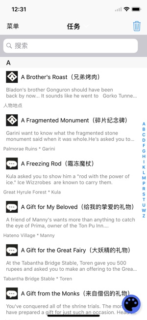 英语、日语苦手?想要更顺畅的加强体验,不妨试用一下! 中英对照学英语?还是你想看看攻略?! 内容持续更新,直到完美! 精力一年的时间,将近70个版本的更新,目前最好用、最方便、地图最为流畅的塞尔达攻略! 目前游戏已有中文,软件里面的内容已经同步官方中文。作为攻略可以很方便的使用! 持续更新,不断根据用户需求添加新功能,让它更加方便、快捷的使用! 预览视频是比较早时候拍的,目前功能已经远远超出了预览视频得功能了。非常方便好用。 ZAD包括:料理列表,配方成分,素材列表(掉落素材的怪物,素材的大概获取地点),套装列表(升级素材,获取方式,强化等级对应的属性),任务列表(任务攻略和不同的排…