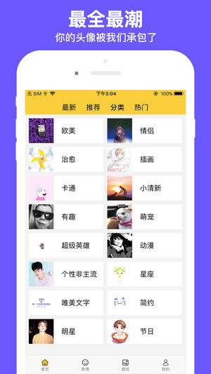 全网最全的头像资源库,定制你的专属个性头像。 大量精美的女生头像,男生头像,情侣头像,动漫头像,卡通头像,可爱头像,唯美头像和非主流头像,是80后、90后和00后更换头像的首选app! 1、几十万个头像素材,总有一款适合你! 2、每日推荐最时尚的头像,涵盖动漫、明星、个性、可爱、二次元等热门头像。头像星人必备! 让你瞬间引爆朋友圈! 3、提供十多个分类,分类清晰明确,快速定位自己的爱好。让你的头像与众不同,个性十足。 4、独家推出的头像一键设置功能,一键换头像,十分方便。 欢迎大佬们使用~