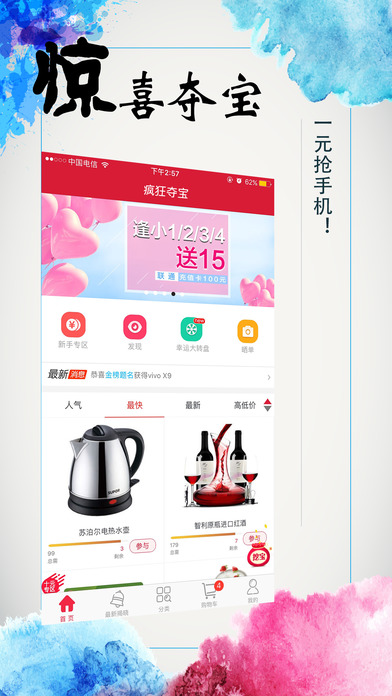 疯狂1元夺宝,充满情怀的众筹购物商城! 一块钱让你买到全世界!天天1元购大奖! 下载即送价值164元的新手红包! ------------------------------ 【实现梦想,只需一元】 一元一个幸运号,参与人次越多,中奖机率越高。人满即开,无需等待,惊喜总是在不经意间! 【新奇小游戏,好玩又赚钱】 发现新鲜有趣的游戏,游戏中赚钱,就是这么简单! 【分享幸运,有图有真相】 一元云购来的幸运岂能不分享,万千用户晒单分享属于他们的夺宝奇迹! 【正品保证,全国包邮】 米粒一元夺宝承诺所有商品100%正品,且全国包邮,百万用户信赖的夺宝平台。 (特别声明:本应用所有活动与内容跟苹果公司无关)