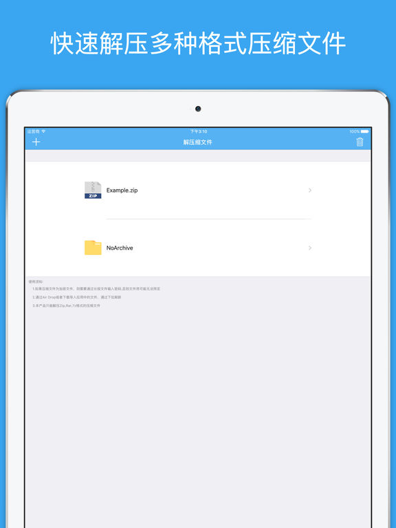 文件解压缩是一款功能强大的zip、7z、Rar压缩文件解压神器! 并提供加锁文件夹,保护您的文件安全! 特点: - 支持Airdrop 导入文档和网址下载文档 - 解压带密码的压缩包 - 支持预览压缩文件(视频,文档,图片等) - 支持Airdrop导出和第三方软件打开编辑 - 支持断点续传 赶快下载使用吧! 如果您喜欢我们的文件解压缩, 我们会非常感谢您抽空给我们一个好的评价。 联络EMAIL: xiangrikuiservice@126.com