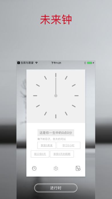 ==最后一天半价!赶快下载吧!== 你的梦想是什么,你想在一生中完成哪些重要的事情? 生命倒计时,提醒你还有多少剩余时间,记下自己的愿望清单,一个一个去实现吧! +++++功能特点+++++ *选择出生日期及预估寿命值,你可以知道你来到这个世界有多久了,还有多少时间留给你; *在剩余的时间里,你可能只有多少次可以陪父母一起吃饭,只能看多少部电影,去多少个地方旅游了…… *记录下你想做的事情,给生命一个倒计时,让你更有动力去实现自己的每一个梦想! 温馨提示:此应用内选择预估寿命值这一功能,仅供参考,不表示真正剩余的生命。