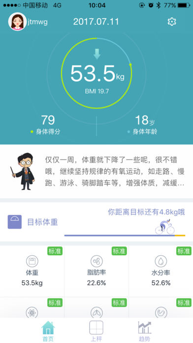 荣耀体脂秤APP需配合荣耀体脂秤使用,使用时需打开手机蓝牙与秤进行连接,APP具备如下功能: (1)支持测量项目:体重、脂肪率、水分率、基础代谢率、内脏脂肪等级、肌肉量、骨盐量、蛋白质、BMI (2)支持历史数据列表、趋势图的方式展示用户测量数据。 (3)支持体脂秤闹钟设置; (4)分析和比较用户测量数据,为用户提供健康报告、健康分析、健康建议。 (5)支持健康报告分享到微信、朋友圈、qq、微博。 (6)支持体脂秤的固件升级。