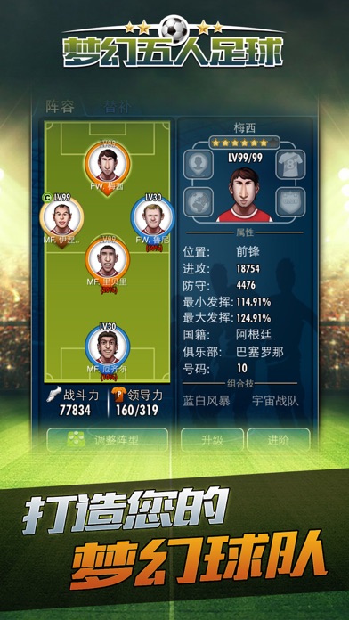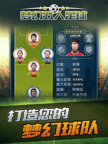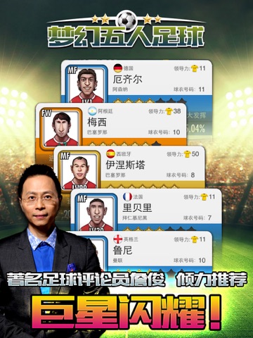 梦幻五人足球 —— 您盼望已久的最强足球卡牌手游终于来了!名嘴詹俊倾力推荐! 在数百位足坛顶级球星中选择您的阵容,与全球数百万玩家同场竞技,争夺王中之王的桂冠,就在梦幻五人足球! ********游戏特色******** 1.精心描绘的数百位顶级球星肖像,满足您的收集愿望 梅西?C罗?里贝里?只要您愿意,都会穿上您钟爱的俱乐部队服为您效力! 2.传奇球星,重温经典 你喜欢球王马拉多纳还是荷兰飞人克鲁伊夫?喜欢内敛的铁人内德维德还是时尚的帅哥贝克汉姆? 在梦幻五人足球里,我们一起寻找逝去的足球记忆~ 3.多重赛事,攀上世界之巅 荣誉之路,单挑足坛各路球星队伍 冠军对决,全球玩家同场竞技,争夺王中之王 4.技能系统,变化多端 撞墙配合,马赛回旋,或是死缠烂打,霸气滑铲? 高空轰炸,手术刀传球...多样技能,任你搭配! 5.经典FM比赛引擎,让您血脉贲张 落后… … 换人… ...反超!胜利来自您的完美指挥! 名嘴詹俊为您配音,激情,要的就是激情!! 6.社交互动,让您和朋友们携手胜利 队长助阵,赠送体力,世界聊天,社交互动让游戏不孤单 ************************ 玩家QQ群:109127132 客服邮箱:yfoot.service@gmail.com
