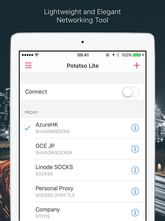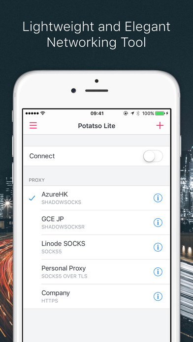 Potatso Lite is a lightweight network tool for beginners. It's simple and easy to use. Potatso Lite and Potatso 2 share the same foundation core. === Features === - Easy to import either through QR code or inputting manually - Both cellular and Wi-Fi are supported - Easy to use: Tap +, scan QR code or input manually, tap Connect and DONE! === How to use === AGAIN: Tap +, scan QR code or input manually, tap Connect and DONE! === Power user?=== Potatso Pro, an ultimate networking tool you must have, supporting multiple profiles , custom DNS, custom rules, network request log and etc...... Download:https://download.potatso.com === Feedback === Manual: https://manual.potatso.com For app-use related feedback, please post through Feedback inside the app Other questions please contact on hi@potatso.com