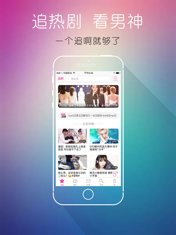 追啊APP是一款专门为热爱韩剧、泰剧、日剧和追明星的粉丝们打造的专属软件。除了能够获取到时下热播剧资源、动态、美图、小视频以外,还可以与其他粉丝一起交流。 同时可以及时的获取idol最新动态及视频资源,看男神海量高清图片,了解idol最新活动资讯,身边的人纷纷在用追啊收资源看热播视频。 更有独家热卖商品等你来看,明星同款看不停~ 官网:www.zhuiaa.com 微博关注@追剧请报社 官方QQ群:144182748 微信公众帐号:追剧情报站