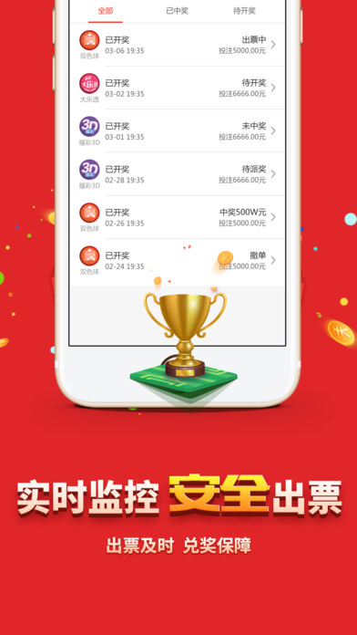 为什么要选择我们? 【全】 彩种全:双色球、大乐透、11选5、快3、竞彩足球、竞彩篮球等。 功能全:智能追号、开奖号码、数据图表、奖金预测、投注分析、即时比分、专家推荐等。 为什么要选择我们? 【快】 开奖快:与官方同步开奖。 派奖快:开奖后即时算奖并派奖。 提款快:提款申请后十分钟内火速到账。 为什么要选择我们? 【稳】 出票稳定:线上下单、线下出票,每一单都真实出票,大奖的绝对保障。 账户安全:支持微信或手机号登录,账户实名注册,派奖提款,我们只认你本人! 为什么要选择我们? 【诚】 我们重视用户体验,只想为您提供一个简单好用的购彩APP;我们重视用户利益,所做的所有功能都只是希望能帮您赢得大奖;我们有专业温馨的客服团队,时刻守候在这里为您答疑解惑。您的满意是我们最大的追求!