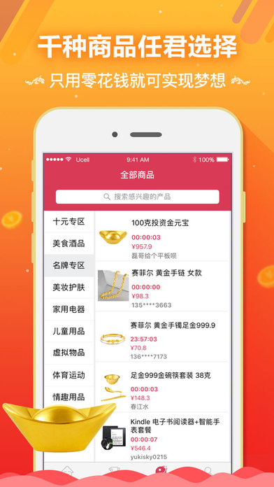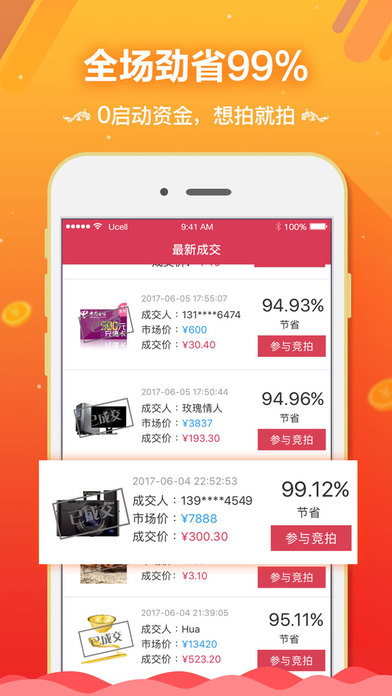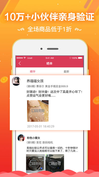 全网最趣味购物应用; 全网最新潮的电子商务理念; 全网最公平的网上拍卖平台; 为您提供全新的娱乐式刺激电子商务购物体验。 【0元起拍,10秒竞拍】 全场商品初始价为0,每拍一次价格只上涨0.1元,10秒内无人竞争,您即可以前所未有的低价带走心仪商品 【商品丰富,任君选择】 全网热销商品,手机,电脑,3C数码,家用电器,日用百货,珠宝首饰等最潮的商品应有尽有,想拍即拍! 【公平公正,好评如潮】 公平:所有参与用户,都享受同样的权利和义务,计算公式和相关数据完全公开 【正品保障】 品牌官方合作,所有商品均经过专业质检,让您买的放心,抢的安心。