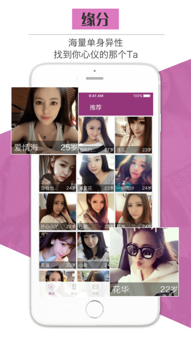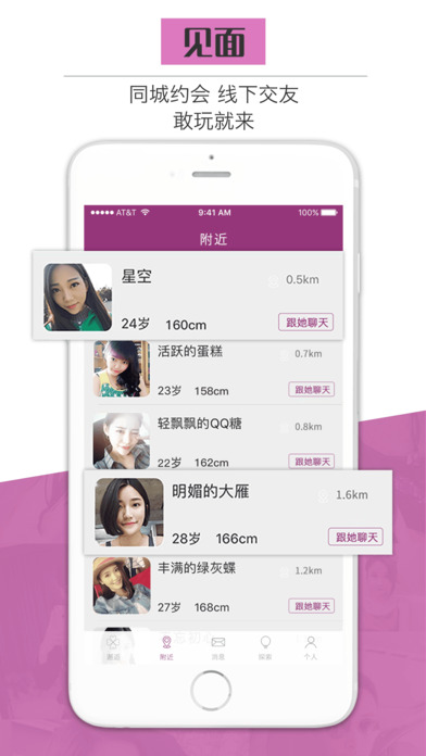 海量真实用户,又快又靠谱的交友平台软件,一键注册马上交友! 【功能特点】 ●一秒邂逅——想聊就聊 ●近距离接触——同城交友 ,约得靠谱 ●详尽资料——合不合适,你看你做主 ●一键打招呼——这么多款,总有一个适合你 ●定位精准——你的TA,缘来就在身边 在线交友,实时互动!别再陌陌的单身一人,赶快加入,遇见你的缘分!