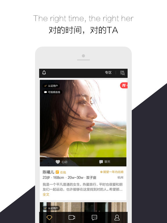 我们只做和你一样认真的专业婚恋平台。 在MarryU,没有人会笑你太认真。 所有会员都必须真实身份认证,让每一个缘分都真实无虚。 [问答] MaryyU(官方版)是什么? MarryU是为有明确结婚计划的优质单身人士提供一个高品质征婚相亲的婚恋平台,全新的实名制认证交友模式,让会员的交友环境有一个真实安全的保障。平台采用身份认证、学历认证、资产认证的模式杜绝酒托,婚托等诈骗行为,保证平台内的会员都是以结婚为目的。 MaryyU认证会员如何? 1、本科及以上学历。 2、以海归、华侨、金融、外企,文化等群体为主,多数有房有车,具备结婚硬件条件。 3、U嫁认证会员有相似的优质生活方式。会员通过U嫁可以寻找到与自己合适的优质单身人士,建立美好的沟通,直到走向婚姻的殿堂。 [功能] 1、寻TA:最美丽的认识从寻TA开始,直接查看会员的真实头像及信息,根据个人要求进行筛选在第一时间找到合适的人,喜欢的人可以直接收藏让对方知道你的心意。 2、消息:希望认识的会员可以直接给对方发送消息进行聊天沟通。 3、我的:个人详细信息的真实,会员信息都是经过严格的审核,可以在第一时间最真实的了解会员的个人情况。 [网友评价精选] “好评!非常给力。U嫁是一个真实的交友征婚婚恋平台,用户都是白领精英,想找对象的不要错过。”by 世纪佳缘红娘网 “非常给力。赞一个!还不错!一款特别好的征婚交友婚恋软件。平时工作没时间,现在在网上就可以解决男票的事,真是太赞了。支持不错赞”by 爱上红娘来了 “通过豆瓣小组介绍来注册的,虽然认证比较繁琐一点,但是这样反而使用起来会很放心,用户也都是很真实,质量都很不错,比有缘网,花田,世纪佳缘的好多了,很多都是名校毕业,也有和我一样是海归国外回来的朋友”by-征婚相亲yy珍爱 “无意间搜索到这个软件,就下载来看看,不巧就看见了有喜欢的女生,试着去认证了,真的是不得不相信会员都是高品质的真实用户,审核也蛮快的,之后我就直接给我喜欢的女生发信息了,还蛮方便的”by--网易cc百合网 “哇塞美女高素质超级多,为我们这种单身人士提供了很多更多的机会百合网”by 花田相亲红娘珍爱 “里面有我心仪的帅哥,条件也不错,征婚相亲还是不错,准备找机会见个面看看感觉礼物说”by--JOY百合网恋爱记 会员来源:奢圈,海归网,圈层,百合,企业家圈,FaceBook,美盟,花田,YHOUSE悦会,世纪佳缘,心心缘征婚相亲网,百合网,世纪佳缘婚恋交友,珍爱网,探探,比邻,yy,脉脉,派派,网易cc,赤兔,友加,礼物说,恋爱记,红娘来了,红娘网等 [联系方式] 网站:http://www.51marryyou.com/ 官方微博:@ MarryYou高端婚恋 官方微信:@MarryYou高端婚恋(marryyouclub) QQ咨询:3228908556 客服电话:0571-81600096