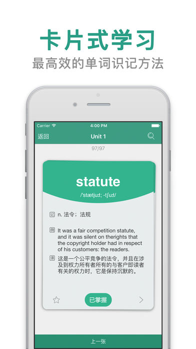 ***考研英语词汇类最受欢迎的产品 ***连续多次荣登Appstore付费教育榜Top5 ***考研英语恋练系列课程与书本的最佳伴侣 =====2018版全新启航===== #词汇同步,高效识记# 词汇完全同步,根据词频按单元划分,全面收录考研英语大纲词汇在历年真题中的用法,识记加应用。而且针对考研环境独创的卡片式学习与通知栏提醒计划,高效识记抗遗忘,真正让你“恋”上“练”词。 #恋练课程,同步练习# 恋练课程中的“Part B 识记检测”和“ Part D 实战演练”可以在APP做啦!上了朱主任的课,不练一练怎么行? #题源阅读,更为懂你# 每月同步来自经济学人的文章,紧随题源,随时随地提高阅读,伟哥力荐! #双语资讯,触手可得# 实时资讯,每日更新,涵盖经济,科技,自然科学,体育,娱乐等主题,让你通过英语这扇窗口,了解国内外的今日头条! #付费,是一种品味# 付费,是一种品味。我们知道,正在考研路上努力你的,容不得任何干扰。将一切广告软文去除,给你一个最纯粹的考研英语APP。 =====反馈方式===== -注:在软件使用过程中遇到问题可以在首屏左上角-反馈社区与我们联系 -联系邮箱:llycapp@qq.com