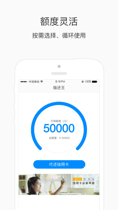 【如何使用】 1、全线上提供个人信息,无人工极速审核; 2、授信成功,最高获得50000元额度; 3、发起借款,钱直接汇到您指定的信用卡中。 【优势】 1、7*24小时全线上申请,门槛低,无抵押; 2、极速审批,闪电放款,最快3秒到账; 3、利率低,多种分期方式任你选择。 【联系我们】 官方微信公众号:zhihuan755; 客服中心:微信公众号搜索“zhihuan755”,在线客服为您解答各种问题。 【APP介绍】 指还王是一款为优质信用卡用户推出的低费率、高额度的信用卡账单分期App。由小花金服研发,利用生物特征识别技术,大数据风控模型,为用户提供专属定制金融服务,实现“即刻申请、实时审批”的极致体验,为年轻的你创造更美好生活方式。信用卡还款,就用指还王。
