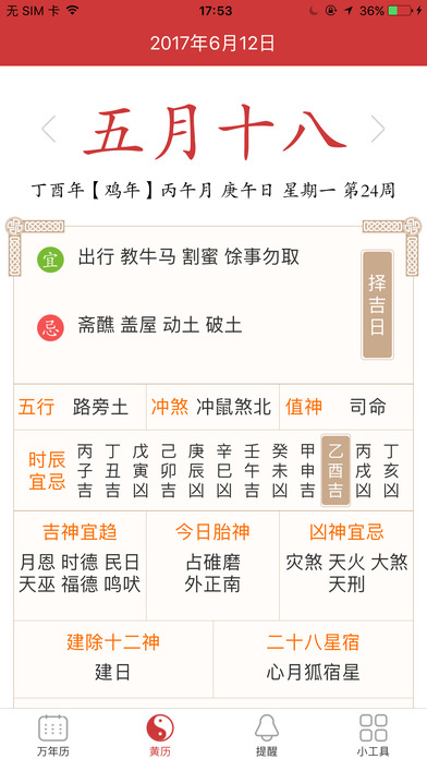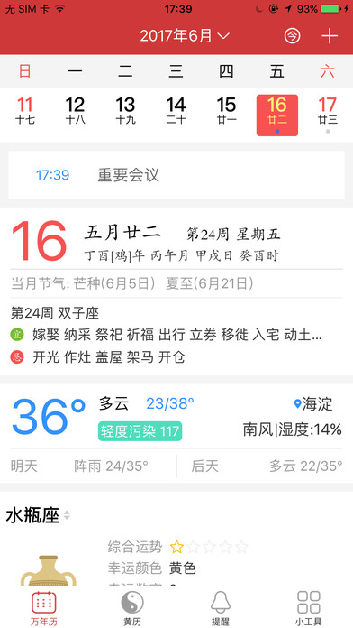 集农历日历、黄历、天气预报于一身的手机万年历app。 爆款万年历日历应用!2017数据全面升级。 实时天气,随时更新,掌握一手天气动态。 节日提醒,节气节日全记录,不再错过。 记事功能,贴心生活助手,随时记录重要事件。 每日一言,每日一张美图,每日一句话。美好心情新起点! 健康养生,给你最优质的养生建议,健康生活从养生开始! 最权威数据,专家级老黄历。你想要的数据这都有。 实时天气,随时更新,掌握一手天气动态。 多数用户选择!靠谱万年历!贴心生活助手!
