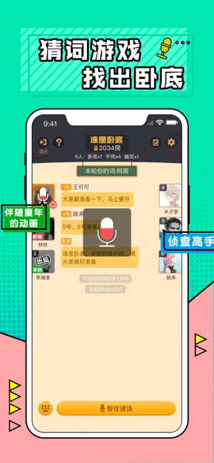 年轻人中最流行的猜词游戏——谁是卧底。 支持实时语音互动,让你与天南海北的玩家互彪演技。 感受语言的魅力,打开你的脑洞,据说智商越高玩得越6。 谁是卧底,经典猜词游戏,比狼人杀简单易上手。一个人想打发闲暇时光却无奈身边没有那么多合适的同伴。谁是卧底APP完成你的梦想: 1、支持实时语音聊天,用语音互彪演技,藏匿词牌,找出卧底,语音游戏同时交友,嗨到停不下来! 2、快速匹配玩家,一个人在家也能拥有聚会派对般的感觉 3、新手不担心,简单易懂的新手指引,让你秒懂游戏规则 4、系统自带法官,自带词库,不用准备任何材料,尽情享受卧底乐趣