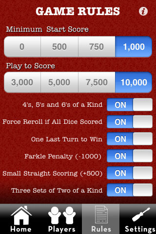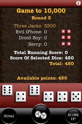 Over 4.5 MILLION games of High Roller Farkle have been played! This is simply the best, most configurable Farkle game on the App Store. Find out for yourself why gamers love this game! Now play your friends anywhere, anytime with full Game Center internet play!!! High Roller Farkle is a fun and exciting dice game for up to four players. Beautiful graphics and elegant game play make this a must have game for your iPod Touch, iPhone or iPad. Using six dice, each player takes a turn rolling the dice and must set aside at least one scoring die (1's, 5's, triples, 3 pairs, or a run of 6.) The player's turn continues with the remaining dice, as long as there is a scoring number or combination. The player's turn ends when they decide to stop and score their accumulated points or until they have a scoreless throw (they Farkle). When all six dice are scored in a turn, the player can roll them all again and continue to accumulate points. Scoring combinations (triples, 3 pairs, or a run of 6.) only count when made with a single throw of all six dice. The first player to score a total of 10,000 or above wins the game! (As long as players with a turn left, don't exceed your score.) If you like games like Yahtzee(tm) Craps, or any other dice game with a blend of skill and luck, then Ten Thousand (aka Dice, 5000, Farkle, Farkel, Deluxe Farkel, Zonk, Zilch, Wimp Out, Hot Dice, Buzzball, Oh Crap, Greed, Squelch) is the game for you! Features - Full Game Center integration for internet play - iPad Support - Retina display graphics - In Game help - Bigger, customizable dice - More Scoring Options (Small Straight, Farkle Penalty, Three Pairs) - Fast Gameplay (Option to auto select all scorable dice) - Online Leaderboards in over a dozen statistical categories! - Integrated Html Help - Four player game play (Any combination of human or computer) - Fun parlor style graphics and sound effects - Lots of game statistics to track how you're doing and to record high scores - Variable AI and game speed - Turn rolling animations on and off - Shake to roll dice (optional) - Show scoring hints (optional) A huge number of game options and variations – make it your game! - Minimum start scores of 0, 500, 750 and 1,000 - Play to 3,000, 5,000, 7,500, 10,000 - Play first to the target or let everyone have one last roll - Change scoring rules to the way you're used to them If you have questions, comments, suggestions about Ten Thousand, please visit our forums at http://www.threejacks.com/support.