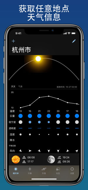 晴天钟按照经纬度显示天气数据,日落日出,月落月出等数据,主要用于天文观测。 晴天钟是一系列天气预测产品的总称,它们主要提取于美国国家大气海洋局/气候环境预测局(NOAA/NCEP)的“全球预测系统”(Global Forecast System, GFS)数值模式。晴天钟在2005年7月作为国家天文台宇宙驿站服务器的实验产品开始运作,并在2008年及2011年进行了大规模的翻新。目前它由中国科学院上海天文台中国天文科普网提供硬件及网络支持。 除去天气服务,晴天钟还提供: 1. 天象预报服务(与位置无关) 2. 光污染地图、卫星云图 3. 恒星、行星、卫星的升落时间 4. 天文交流论坛 如…