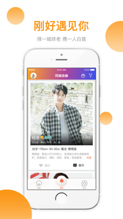 同城佳缘--单身离异的都在用的高端精英同城约会平台 同城佳缘是什么? 同城佳缘是为有明确结婚计划的优质单身人士提供一个高品质征婚相亲的婚恋平台,通过实名认证、资产认证的方式彻底的和探探、陌陌、世纪佳缘珍爱网等传统的交友平台区分开。 功能亮点: 实名制注册。用户在注册时候都将进行实名制审核,真实照片,人工审核。维护高品质的社区氛围, 杜绝婚托、广告等诈骗行为,多机制确保资料真实性。 精彩评论: “好评!非常给力。同城佳缘是一个真实的交友征婚婚恋平台,用户都是白领精英,想找对象的不要错过。”by 探探不是我的名字 “非常给力。赞一个!还不错!一款特别好的征婚交友婚恋软件。平时工作没时间,现在在网上就可以解决男票的事,真是太赞了。支持不错赞”by请叫我活雷锋 会员来源:奢圈,海归网,圈层,百合,企业家圈,FaceBook,美盟,花田,YHOUSE悦会,世纪佳缘,心心缘征婚相亲网,百合网,世纪佳缘婚恋交友,珍爱网,探探,比邻,友邻,B612,marryU,一伴,爱到,adore,yy,脉脉,派派,网易cc,赤兔,友加,礼物说,恋爱记,寺库,网易严选,airbnb,小红书,红娘来了,红娘网等