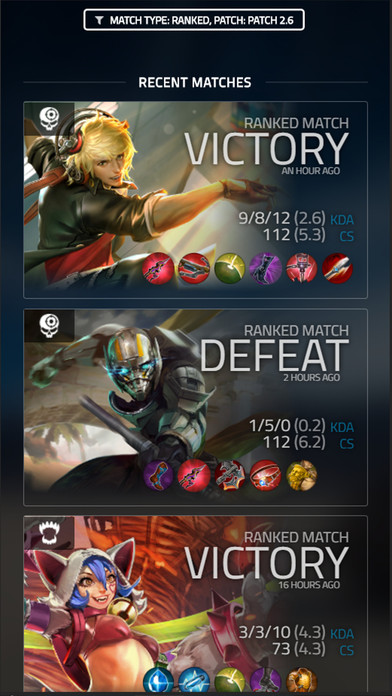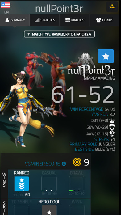 vgminer makes it easy to view your wins, losses, and analyze your statistics in one place! Valuable information such as KDA, CS, and even damage graphs for each match are available with a tap! Many more features are included: vgminer Score™ - measure your progress in each patch! Scores are given for hero diversity, win percentage, total wins, role diversity, etc! Graphs Galore! - Hero Pool - Win Percentage by Hero - Average Kills/Deaths/Assists - Win Percentage over Time Match Results! - View the results of each match Hero Summaries