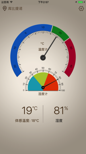 一款简单实用,设计清新的温湿度计,能够实时监测你所在地区的室内外温度、湿度、天气情况以及体感温度等,让你随时随地有备无患,居家旅行必备! ==应用特色== -简洁明亮的界面设计 -自动同步所在地,无需手动选择 -自动显示全天气温、当前温度、体感温度,无需刷新 -提供华氏温度与摄氏温度选择 -以图表和百分比形式展现当前湿度 -获广告支持,可升级至无广告版