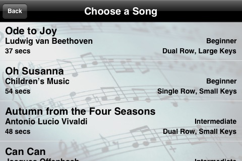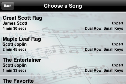 From the makers of Pocket Piano ( Best of 2008 Apple Apps )... Player Piano doesn't just play piano music, it lets you play it too. With Player Piano you can choose to either listen to a song or play along. You can play the top row and let the player piano play the bottom row, you can play the bottom row and let the player piano play the top row, or for a real challenge you can try to play both rows. Player Piano's songs are the complete song with chords and both hands. You can choose how much or how little of the song you actually want to play, and let the player piano play the rest. The result is beautiful music every time, and you will be amazed at what you and the player piano can play. Player piano displays the notes falling in smooth animation to the tempo of the song. Keys are highlighted to let you know to press them, and each piano note is accurately labeled and has a tail to further signify how long the note should be held making playing the piano possible for everyone. With over 200 full length songs in a variety of categories, you're sure to have hours of fun with this app. Here is just a sample of some of the categories and songs: Ragtime: Maple Leaf Rag, The Entertainer, The Favorite, and more... Beethoven: Fur Elise, Ode to Joy, Moonlight Sonata, Hammerklavier Sonata, and more… Mozart: Eine Kiene Nachtmusik, Turkish March, Sonata 311, and more... Bach: Minuet, Air on the G String, Badinerie, and more... Russian Classics: 1812 Overture, Flight of the Bumblebee, Polovtsian Dance, and more... Patriotic: America the Beautiful, God Save the Queen, La Marseilleise, and more... Christmas: Good King Wenceslas, Ave Maria, Excerpts from the Nutcracker Suite, and more... Traditional: Greensleeves, Kalinka, For He's A Jolly Good Fellow, and more... World: La Cucharacha, Danny Boy, Can Can, O Sole Mio, and more... Children's: 10 Little Indians, Oh Susanna, Sailor's Holiday, and more... There are even more categories and more great songs, so get it now and start playing or listening to great piano music today! To see Player Piano in action, go to www.youtube.com/BetterDayWireless