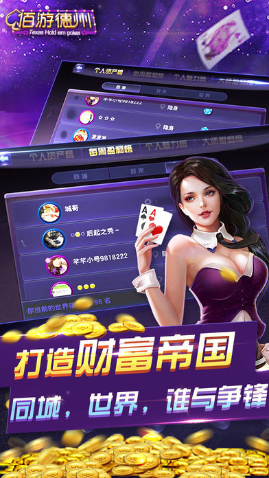 风靡全球的休闲扑克游戏,潮人热捧绅士钟爱,火爆有趣,益智休闲,投资人、创业者 、金融家都力荐的好游戏。 《佰游德州》是在基于德州扑克传统玩法和规则上的创新精品之作,独有同城切磋、陌陌一键登录、陌陌好友圈牌技比拼、玩家地理标示……更多玩家互动,更多丰盛奖励,更多细节玩法,给德州玩家带来最纯正最丰富最具吸引力的德州扑克游戏享受。 游戏特色 【独有同城切磋】 玩家可以选择同城玩家一起游戏,更多共同语言、同桌游戏感受更嗨。 【拍照分享、实时互动】 游戏界面即时拍照,可分享至陌陌留言板,晒成绩比运气,也可保存至玩家手机相册建立游戏照片库。 【更多好友信息查看】 除游戏常规信息显示外,添加好友还可查看与其他玩家的地理距离、性别、年龄、星座。了解更多、距离更近,邂逅同城德州女神。 【三大排行、成就感爆棚】 采用最全面的排名系统,同城排行、好友排行,世界排行,精湛牌技共同见证,打造属于自己的财富帝国。 【无需注册、一键登陆】 陌陌账号一键登陆,无需另行注册,打开APP就能玩。 【精致画面、操作简单】 细腻质感界面, 清新蓝绿色调,简单方便的操作体验,即使新手玩家也可快速上手。 【聊天互动,趣味表情】 邀请陌陌好友一起游戏,与游戏中的牌友聊天互动交流,真正做到娱乐社交两不误。精彩陌陌聊天表情,文字不过瘾表情更传情。 如有需要欢迎联系! TEL:021-62226896-834 邮箱:kefu@baiyou001.com