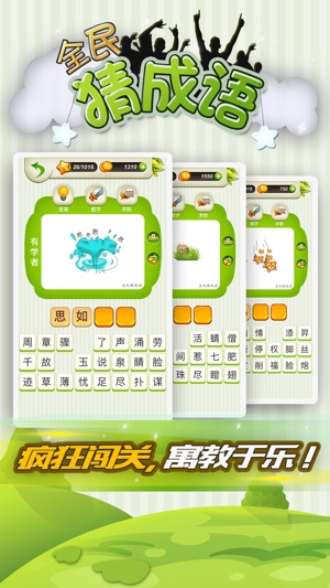 全民猜成语挑战您最强的大脑,通过成语图片来猜出成语,是一款寓教于乐的益智成语游戏。 全民猜成语汇集了上千多个经典的成语,让你在汉字王国的海洋里尽情享受中国博大精深文化的熏陶,做一个真正的中华学霸。 您可以通过微信求助和挑战你的朋友们,看看谁是成语达人。 游戏特色: 1、上千个游戏关卡,挑战你的大脑极限。 2、完美支持iphone,ipod,ipad等全系列苹果智能移动设备 。 3、支持游戏排行榜,和其他玩家一拼高下 。 联系QQ:18137575