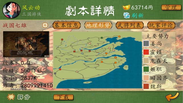 三国策略战棋游戏,体验历史与文化的融合,点出英雄的主题。在地图、城池、战场、海外等场景中,浸润浓厚的中国风,开始奇妙的旅程。以君主角色扮演,了解风土人情,游历神州大地,寻访海外仙山,探索未知世界。寻师访友,结识各路英雄,选材用人,招兵买马,席卷天下,再创辉煌治世。 玩家评价: 良心之作,我非常喜欢这个游戏,希望以后多开发——濯 比现在卡牌类的游戏强太多了!希望能继续出新剧本——BKJCL7 游戏做的很用心,有一种温暖人心的家国天下情怀,尤其在剧情结尾的时候——江山樵 难得见到这么中国风的手游,比那些什么q版萌版卡牌强多了,希望我们自己风格的手游的越做越好——raydongc 若有任何意见或建议…