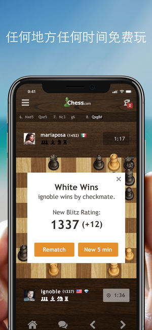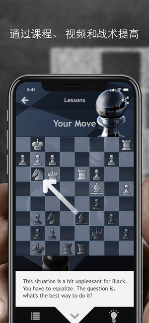 与全世界数以百万计的棋手对弈!享受免费无限制的对局并利用50000+道战术谜题,互动课程和视频,以及强大的电脑对手来提高您的棋力。今天就释放您成为国际象棋大师的潜力吧! 对弈 - 挑战您的好友并与对手交谈 - 下实时超快棋或每日通信棋 战术谜题 - 解开超过50000道谜题 - 根据您的水平进行调整以助您提高 课程 - 来自顶级特级大师们,数以千计的视频和互动课程 - 含有提示和重点的互动教程 电脑 - 调整电脑的强弱 - 分析您的对局以学习哪里出了错 …以及更多 - 顶尖作者和教练(如国际大师 Jeremy Silman)的每日文章 - 开局探测器帮助您学习并走出正确的开局 -…