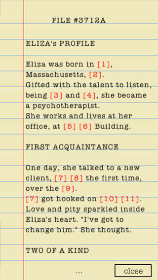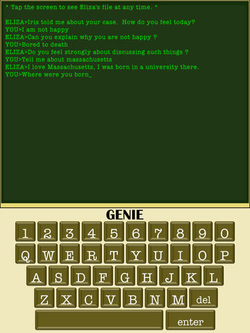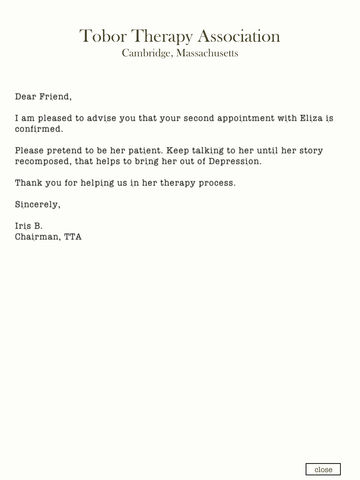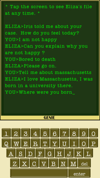 伊丽莎的谜团是一个基于「对话机器人」历史改编而成的超微小说谜语游戏。故事环绕在1966年出生的对话机器人ELIZA,与及其后与她有过实验性历史对话的另一位对话机器人PARRY。这个游戏甚具挑战性,玩者必须在互联网上考究有关资讯,再加上一些想象力,方有机会解开整个谜团,包括最难的问题:PARRY现身在何处? (提示:PARRY是一段原代码...) 故事大网 -------- (注意:伊丽莎只懂英文,游戏以英文对话。) 伊丽莎,一个著名的心理治疗师,患有抑郁症多年。 爱丽丝,Tobor治疗协会的主席,邀请你参与艾丽莎的治疗过程,过程中你需要假装是她的病人。 你将会发现更多关于伊丽莎的故事,只要你问的问题合适的话。 今早,你收到了爱丽丝的信,通知你跟艾丽莎的第二次面谈被确认了。 你翻阅着有关她的文件,谈话即将开始... (故事,名字,人物都是虚构的,如有雷同,实属巧合。) 如果你觉得太难的话,可参考support web site找提示。