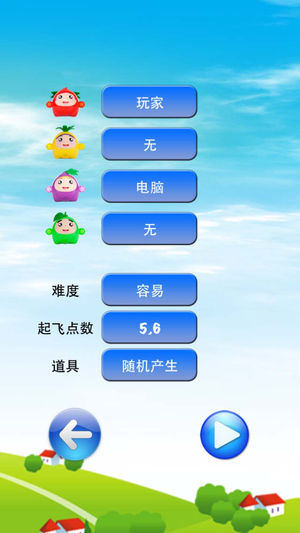果宝飞行棋在传统飞行棋基础上改进了棋盘,使用可爱的水果宝宝形像做棋子,更适合于儿童玩耍。 红草莓,黄菠萝,紫葡萄,青苹果比比看,谁跑得快,谁跳得远,谁能先到达终点。 随机产生道具钢铁机甲,导弹和遥控骰,棋子走到相应格子可拾取,更有意思,更好玩。 可以与电脑对战,也可多人对战,而且都可以拾取和使用道具哦。 经典无道具模式和随机出现道具可自己选择。 游戏内无广告,无付费道具