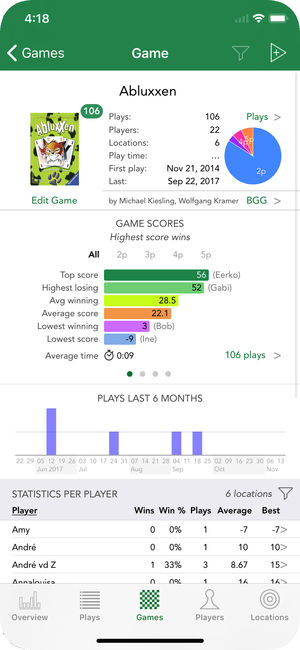 Keep track of your Board Game plays and scores in this easy to use tool. View statistics and graphs for your games, plays, and other players. - How many games did you play recently? - Who scored the highest for a game? - With whom did you play and who wins more? - Did you improve your score from la…