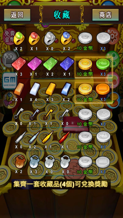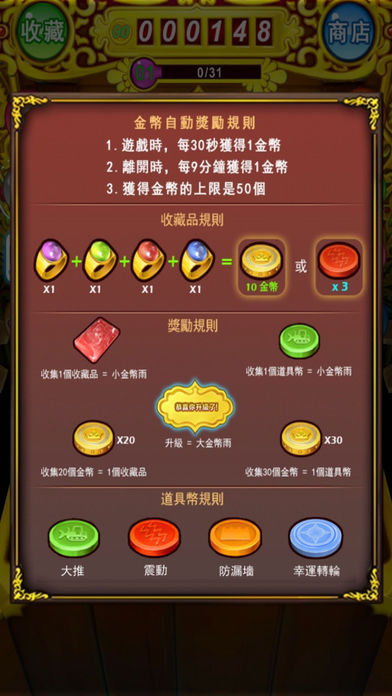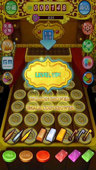 【关于黄金版本】 去除广告条 更多的免费游戏币:初始数量比免费版本多很多 【游戏介绍】 经曲的推金币游戏, 搭配华丽大气的设计风格, 绝对能让您眼前一亮。 加上游戏中随机内置的各种收藏品, 最适合有收集僻好的玩家大展身手。 收藏品套装更可以兑换游戏币或者丰富的道具币。 加油吧!骚年! 【游戏玩法】 玩法简单却乐趣无穷, 游戏中玩家控制金币掉落桌面, 推台不断推送面前的金币使它们掉进得分洞中, 最终成为玩家的囊中之物。 【游戏特色】 - 仿真金币机游戏效果,华丽大气的游戏界面 - 简单易懂的操作方法,爽快刺激的玩法 - 超多豪华道具,让您收集乐不停 - 轻快的游戏音乐,给您推金币的真实视听体验 - 严密的升级系统,绝对激发您的挑战欲望 >>>>>更多功能即将推出…