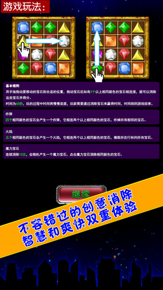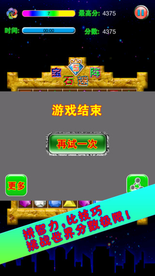 《宝石迷阵5 HD版》是一款锻炼眼力的宝石移动消除游戏。这是一款简单易上手的休闲游戏。有趣又耐玩,绝对让你停不下来。 游戏规则: 用手指拖动要移动的宝石到合适的位置,拖动宝石后如有3个以上相同颜色的宝石相连接,就可以消除这些宝石并得分。消去后填充的宝石如果也能形成3个以上相同颜色,会引起连锁反应,其乐无穷。 时间为60秒,玩的过程中时间将慢慢流逝,玩家需要通过消除宝石来赢得时间,时间到则游戏结束。(如果出现无宝石可消除的状况将会重新洗牌 ) 道具: 1. 炸弹:四个相同颜色的宝石会产生一个炸弹,它相连两个以上相同颜色的宝石,炸掉所有相邻的宝石 2. 火焰:五个相同颜色的宝石会产生一个火焰,它相连两个以上相同颜色的宝石,摧毁所在行和列所有宝石 3. 魔力宝石:连续消除10次,会随机产生一个魔力宝石,点击魔力宝石消除相同颜色的宝石。 漂亮的宝石,爽快利落的操作,美妙的音乐,清新的界面,好玩的玩法,丰富的道具,放松自己,邀请朋友一起来玩宝石迷阵5 吧!