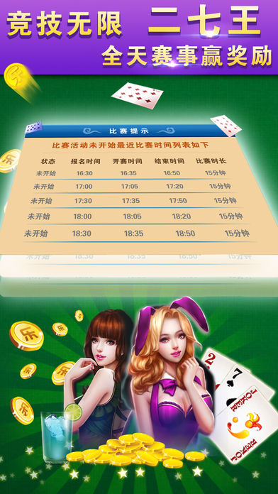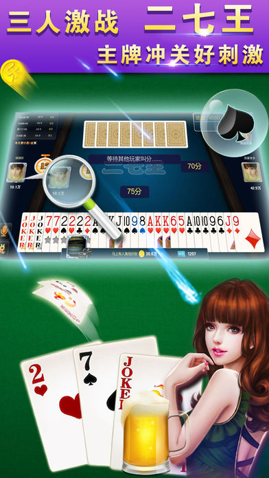 二七王游戏棋牌平台,万人在线,每日大奖赛,金币领不停,同城乐二七王是地道的二七王本地打法。二七王采用的是3D场景技术,是用户体验舒适的棋牌手游!同时二七王还支持互联,可以和朋友同时在线玩地道的二七王。三人二七王简单说就是二打一的拖拉机游戏,游戏规定大王,小王,2,7为常主,故名二七王。 一、牌数 二七王打2副牌,去除3和4,共计,92张. 二、术语 分牌:升级游戏中每张 5 、10 和 K 是分牌, 5 代表 5 分, 10 代表 10 分, K 也代表 10 分,一副牌共有 100 分,两副牌共 200 分。 底牌:打两副牌时每方得牌 28 张,剩余的 8 张牌为底牌。在确定庄家后由庄家取走底牌,而替换成庄家不需要的同样张数的牌作为新的底牌重新扣下。 主牌:主牌由大王和小王、2、7和主花色牌构成,大小顺序为大王 > 小王 > 7 > 2。 副牌:除主牌以外,其它牌都是副牌。大小顺序为A>K>Q>J>10>9>8>6>5. 对牌:两张同点同花色的牌称为一对牌。 三、游戏规则 3人游戏,始终打7,王、2是常主,8张底牌,必须主牌抓底,副牌不能甩。