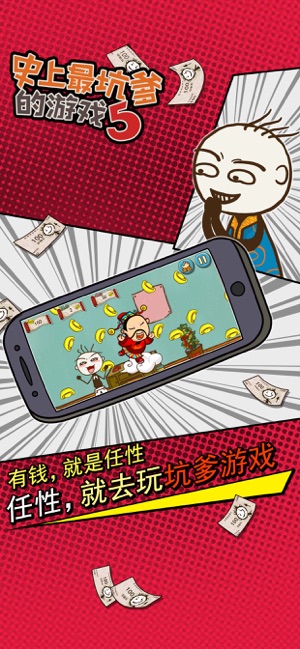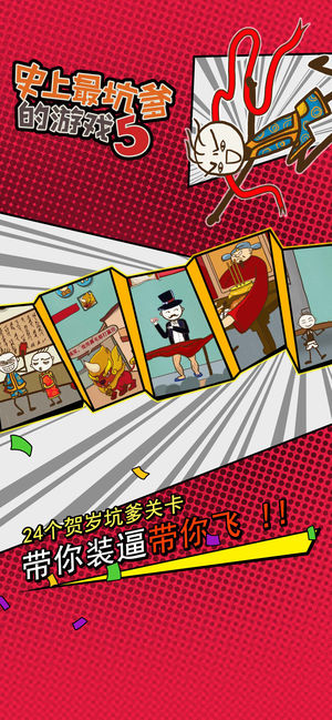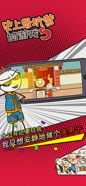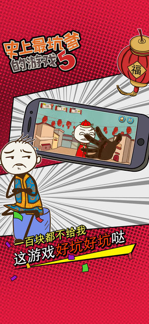 【获得荣誉】 曾获AppStore益智解密类游戏No.1; 曾排名AppStore中国区总榜前3,香港地区第1、台湾地区前5名; 曾被中央、广东、港澳台等数十家媒体采访报道; 【产品简介】 史小坑来拜年啦!这是《坑爹游戏》首次推出的新春节日版。游戏中除了有传统“坑爹系列”的24个坑爹关卡外,还加入了各种接地气的新春元素,让玩家在游戏过程中充分体验到过年才有的各种搞笑趣事:抢红包、贴春联、放烟花……。 希望你们被坑了一圈之后,都还好好的,幸幸福福的过个好年!!在游戏中领略到生活的乐趣,在史小坑的世界里,你将享受到无尽的快乐! 【产品特点】 特点一:这是一个很令人上瘾的游戏!有创意!够坑爹…